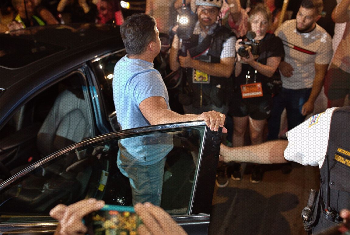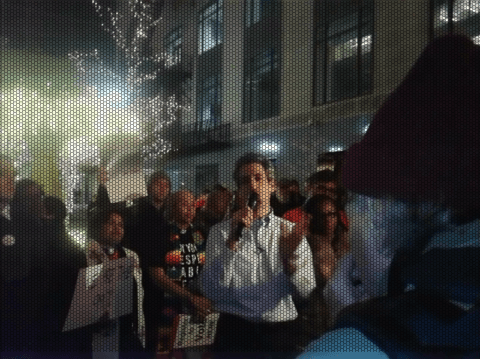An activist shouts through the bullhorn as Vice President Mike Pence lands at O'hare International Airport.