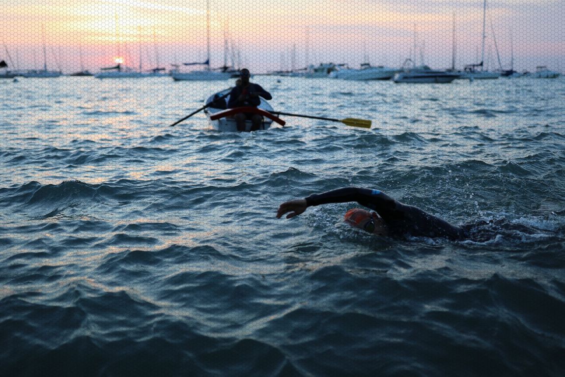 Internationl swimmers tightly compete in the Chicago Triathalon as the Sun breaks over Lake Michigan
