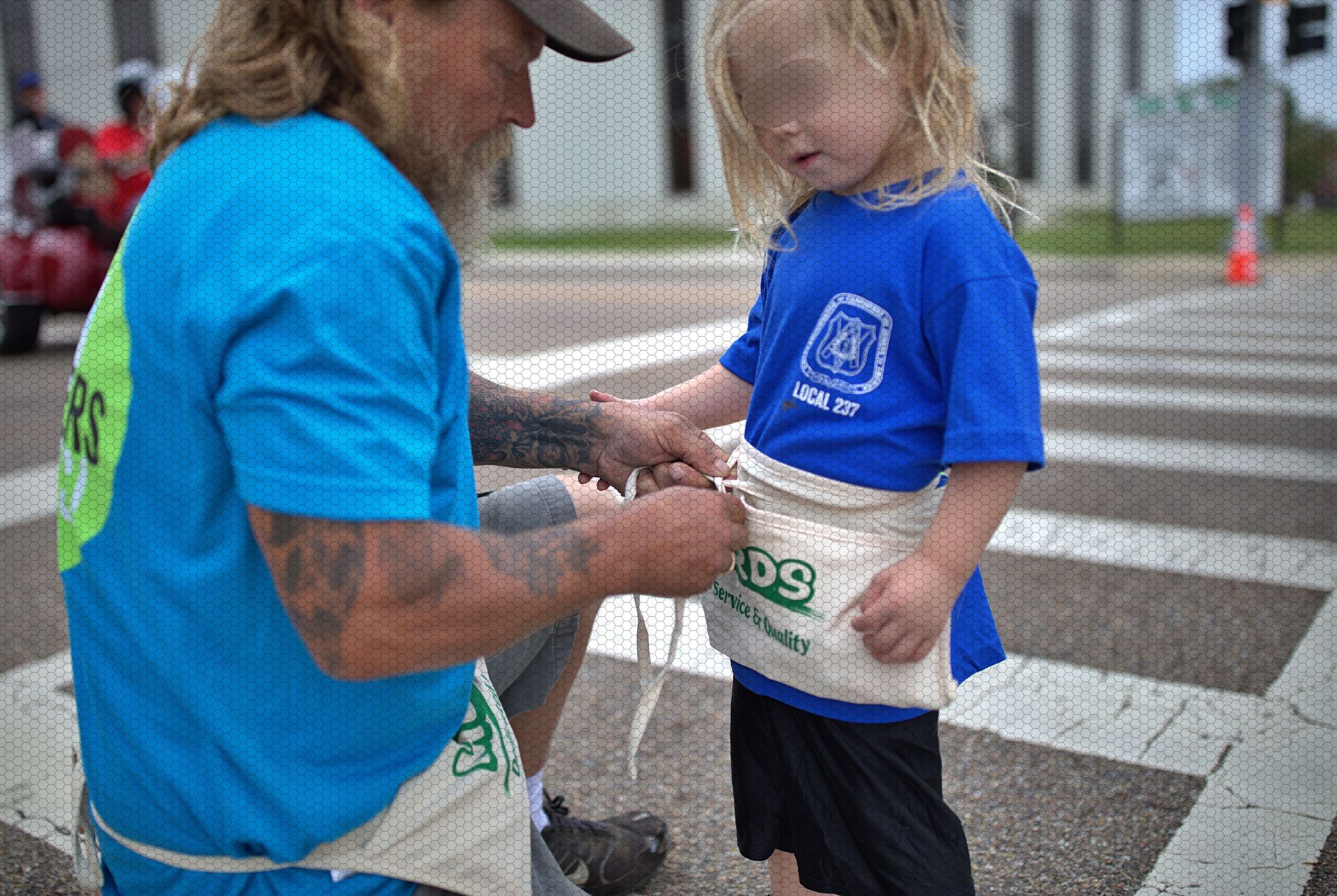A Man with Crapenters Local #237 ties a young paradegoers apron.