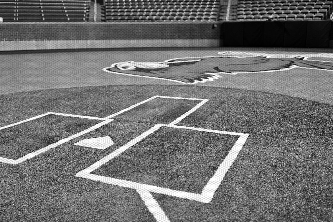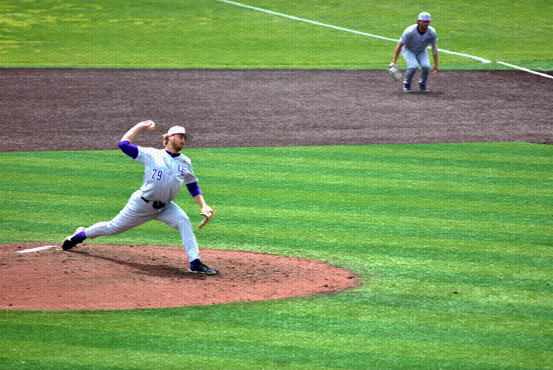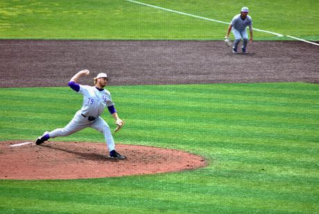 A pitcher for NCAA Division I Evansville University Baseball team the Purple Aces hurls the ball to the plate as the First baseman prepares to field.