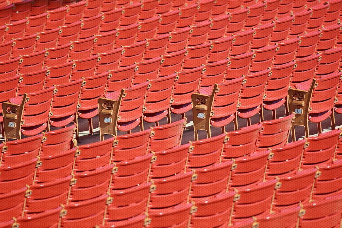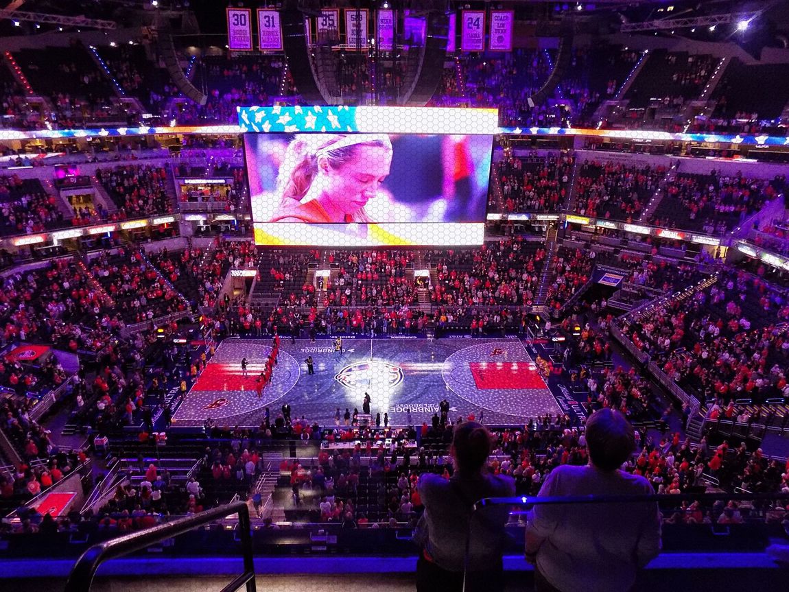 Lexi Hull can be seen on the jumbotron in deep thought and reflection during the National Anthem, while fans stand in respect at an Indiana Fever vs. Chicago Sky game.
