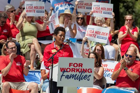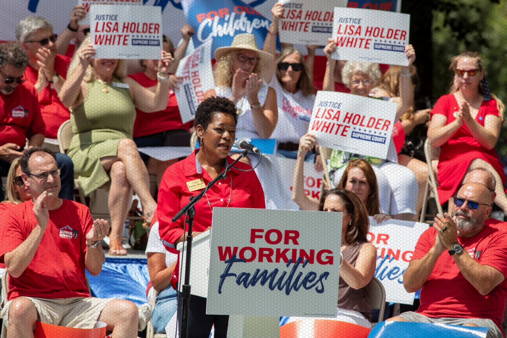 Lisa Holder White, the first Black Female Illinois State Supreme Court Jusitice, addresses the crowd with enthusuastic supporters behind her.