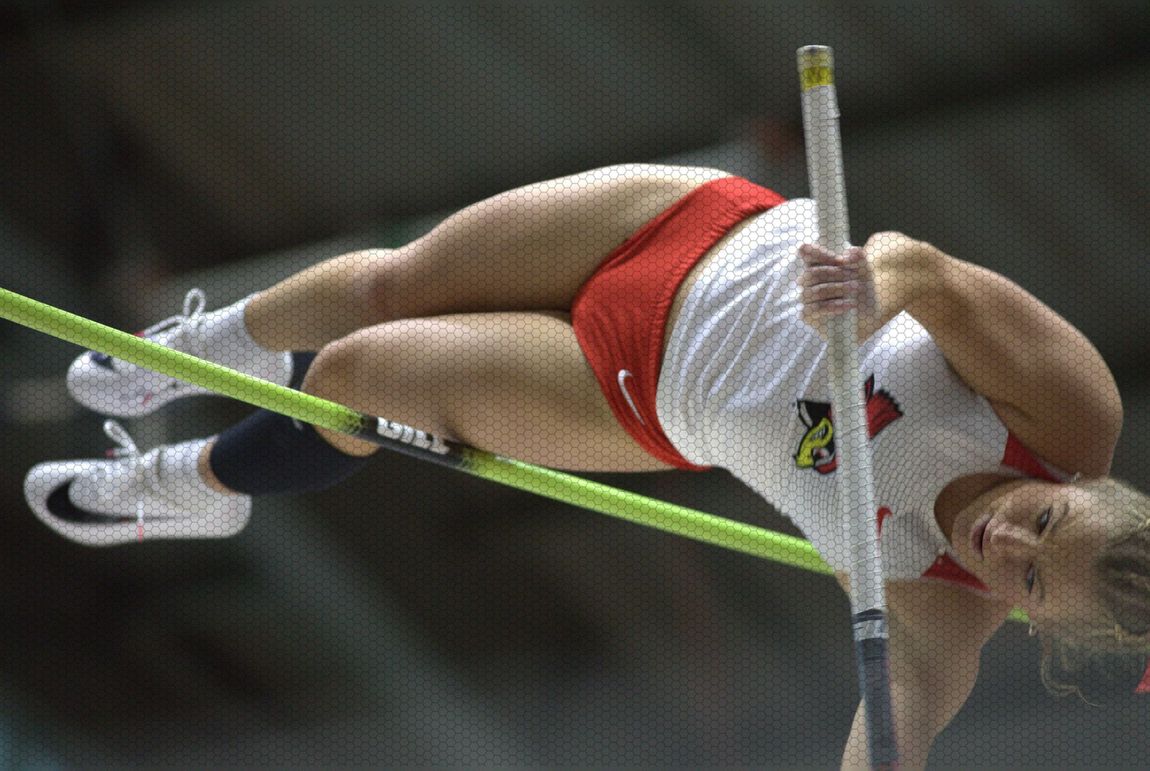 A Women's Illinois State University Pole Vaulter flies over the bar