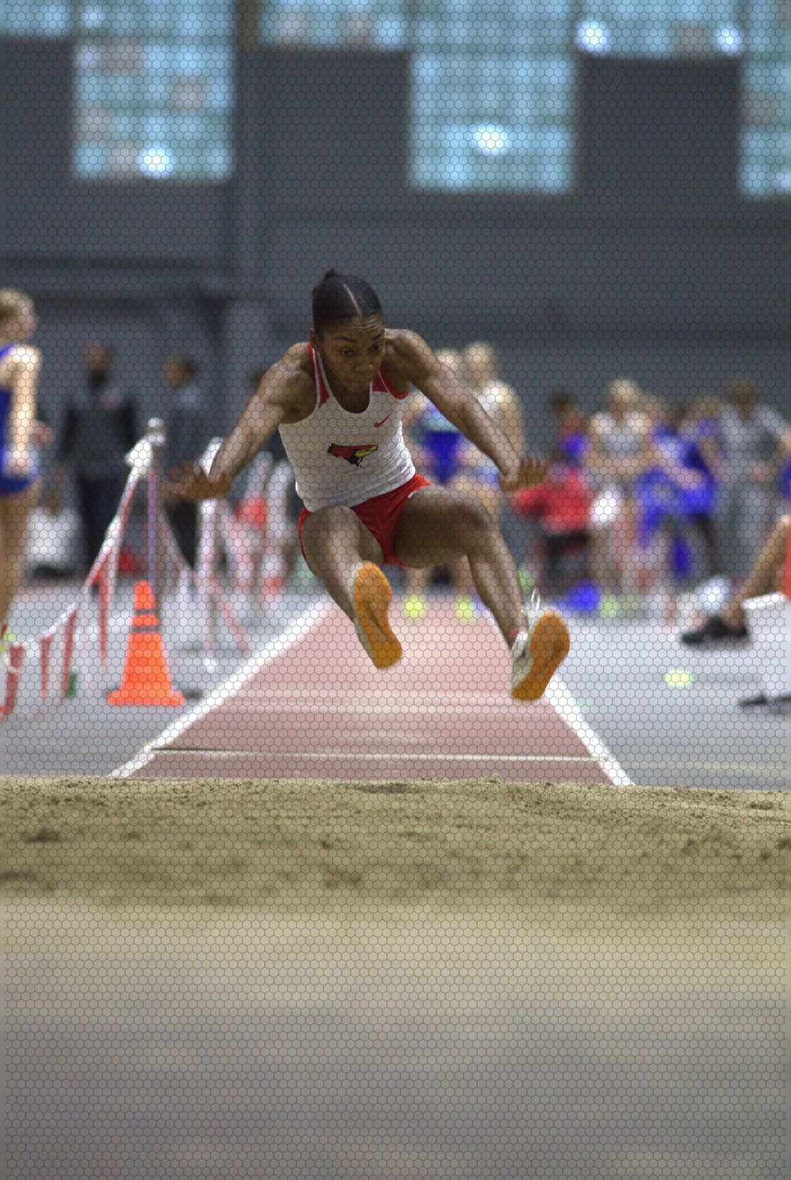 A Women's Illinois State University long jumper launches herself into the sand pit.
