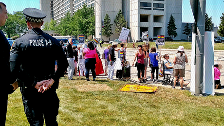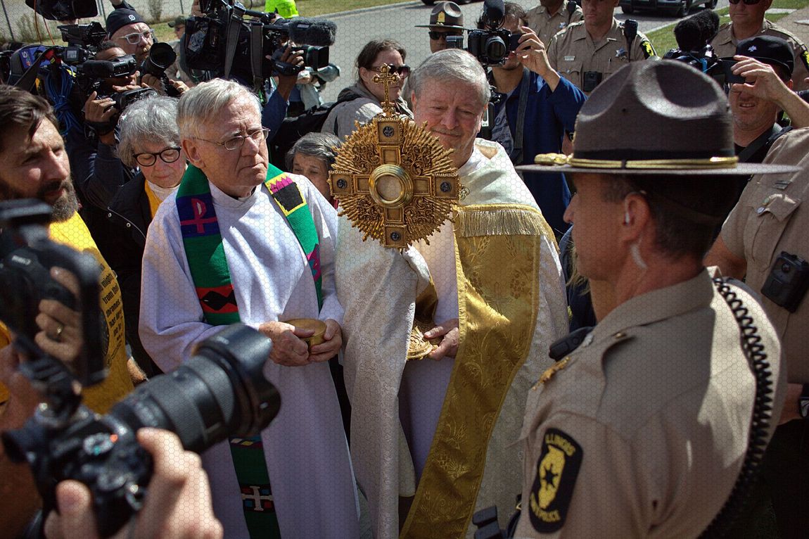 Father Dan Harnett and Father Larry Dowling of St. Eulalia Catholic Church speak with Lt. Col. Jason Bradley, Assistant Deputy Director, Division of Patrol Operations Command I.S.P. The Church congregation was attempting what ISP categorize as an unauthorized entry into the facility, in order to provide detainees at the Broadview Ill. I.C.E. facility with Saturday communion.