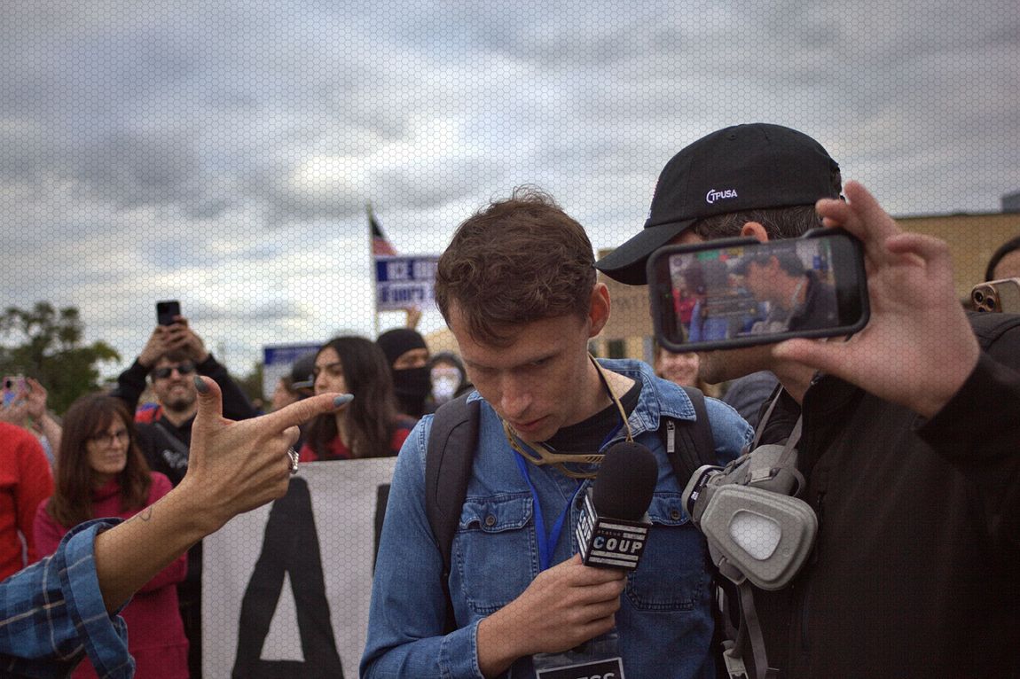 An I.C.E. protestor makes a gun gesture towards conservitive Influencer Cam Higby as he livestreams, reflecting the rise in leftists political violence.