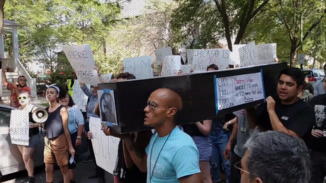 Popular photo of activists carrying a make shift coffin representing victims of gun and gang violence in Chicago.