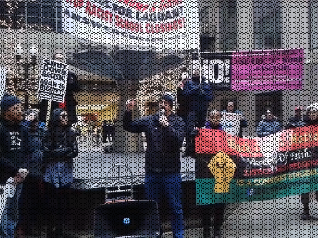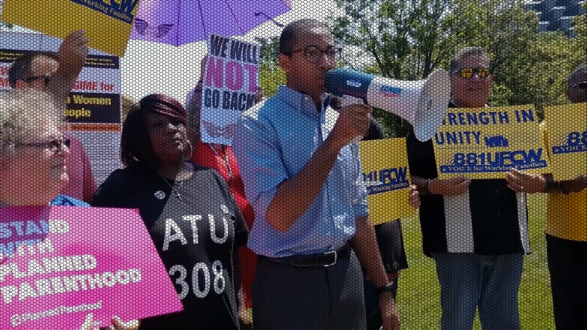 Illinois Representative Christian Mitchell makes a an appearance for a quick photo op during a protest against Vice President Mike Pence landing in Chicago.