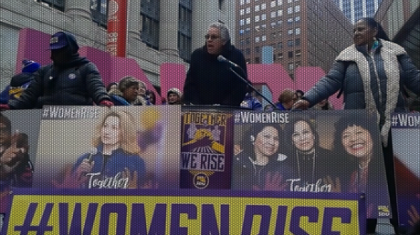 Cook County Board President Toni Preckwinkle addresses the crown in front of the Thompson Center on International Women's Day.