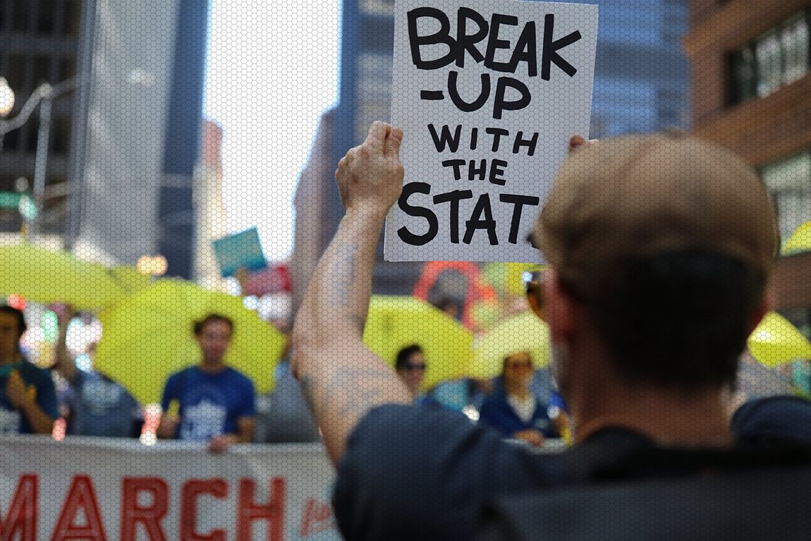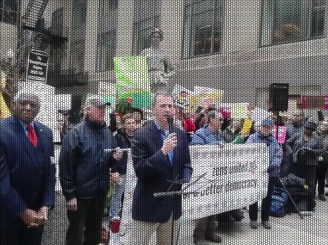 Former member of the Illinois Senate and Illinois House of Representatives, controversial mathematician and uber progressive Mayor of Evanston, Daniel Biss takes the microphone during a tax day protest at the Chicago Board of Trade.