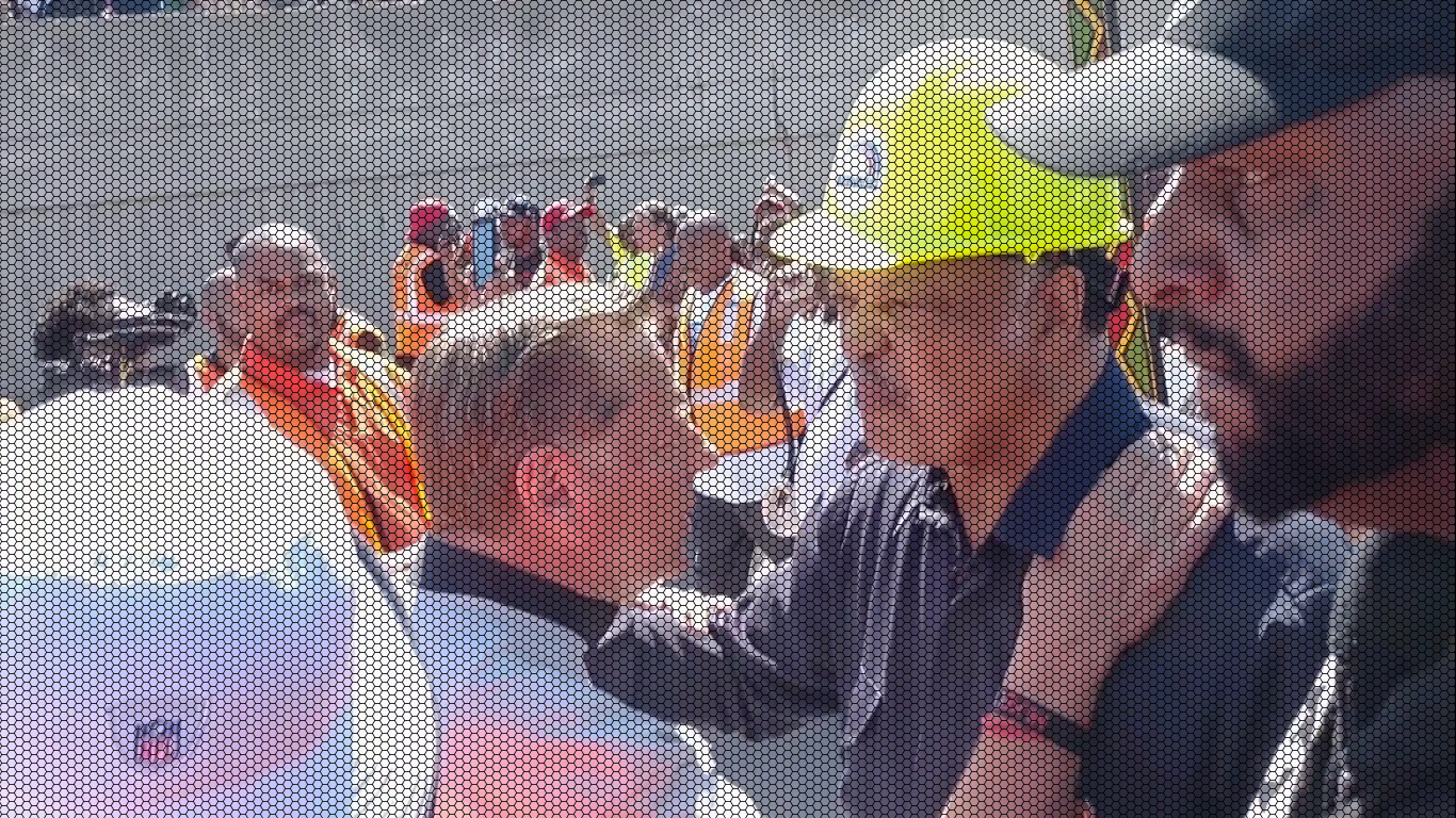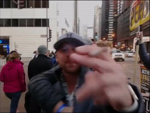 Another of many random attacks faced on the job as an unstable activist tries to burn the camera lens with his cigarette.