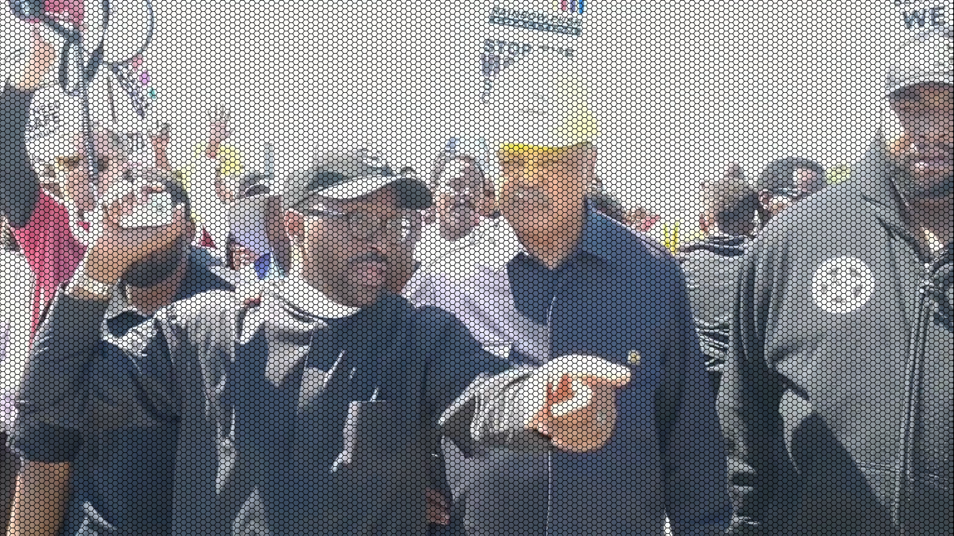 Crowds march out of Daley Plaza as the famous Calder's Flamingo can be seen in the background.