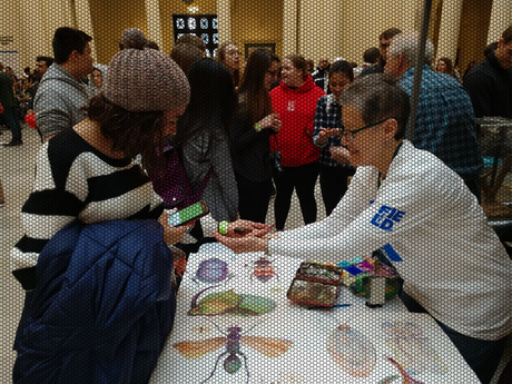 An entomologist assists a very brave patron as she handles a Madagascar Hissing Cockroach.