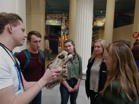 A group of young aspiring S.T.E.M. candidates focus on the words of a museum tour guide.
