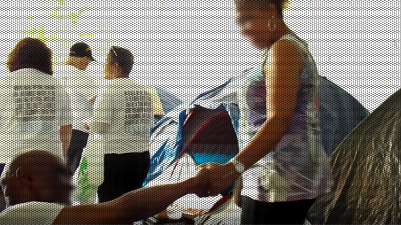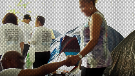 A Church parishion distributing Love, Food and the Holy Spirit to homeless individuals.