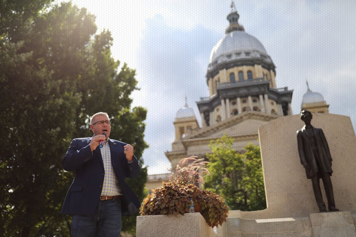 Illinois 2022 Gubernatorial Candidate Darren Bailey passionately addresses his supporters in front the the State Capitol Building.