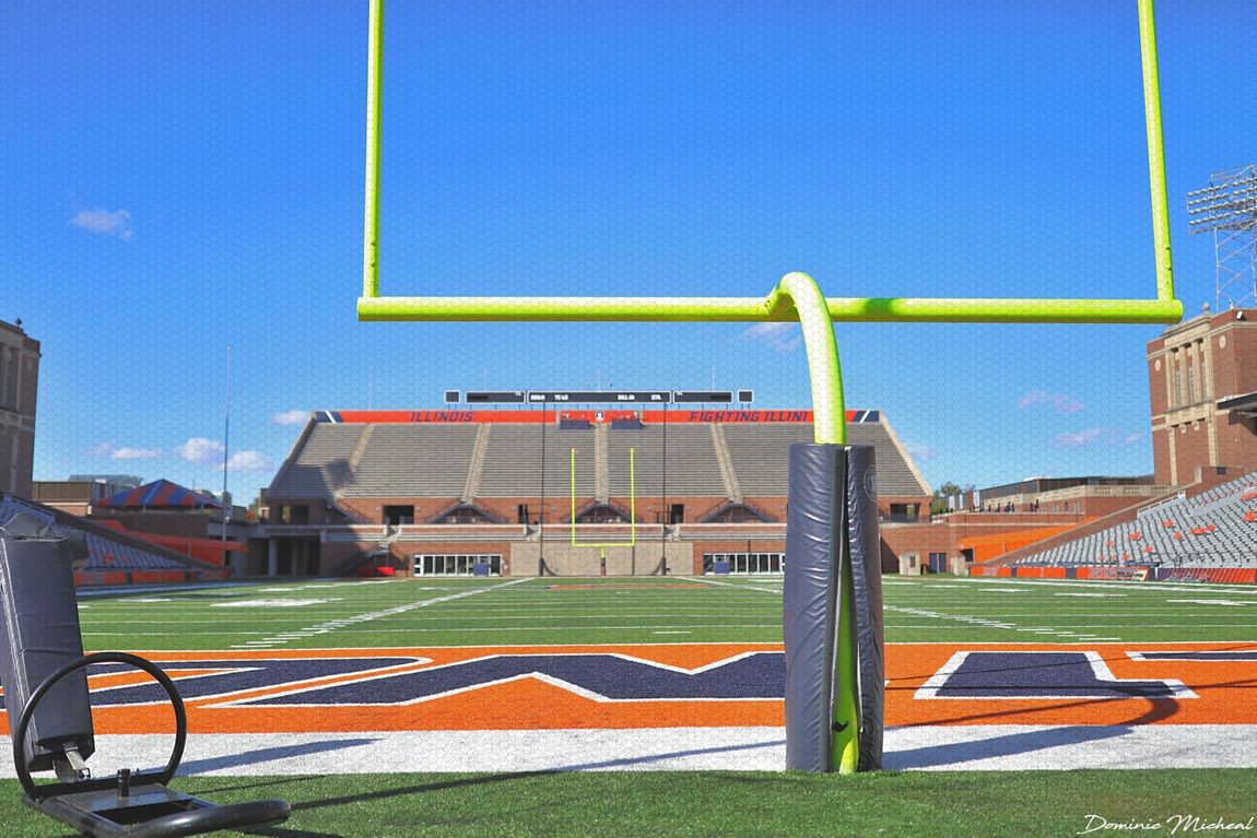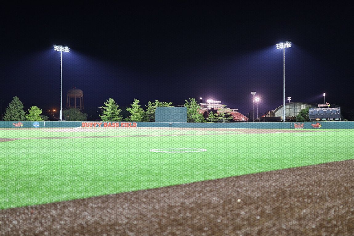Night shot from Duffy Field at Illinois State University showcasing Horton Fieldhouse and Hancock Stadium in the background.