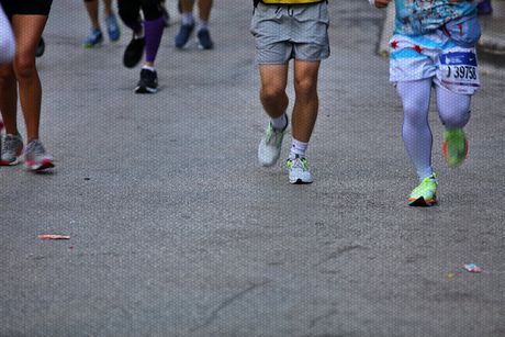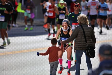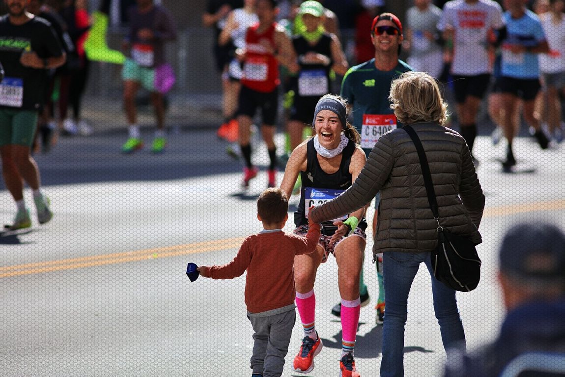 This photo captures the endearing moment when a joyous set of marathon running parents greet thier child breifly before going on to the finish line.