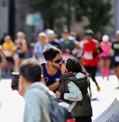 An effectionate photo of couple kissing while being filmed by a relative during the Bank of America Chicago Marathon.