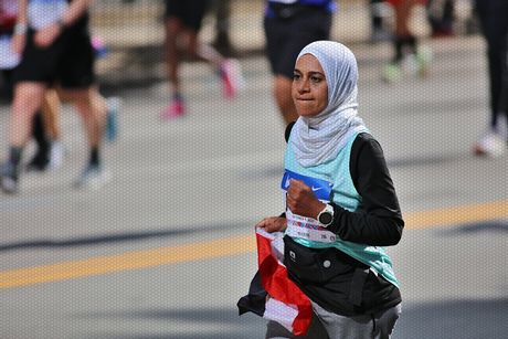 An Iraqi Woman runs the Chicago Marathon with flag in hand.