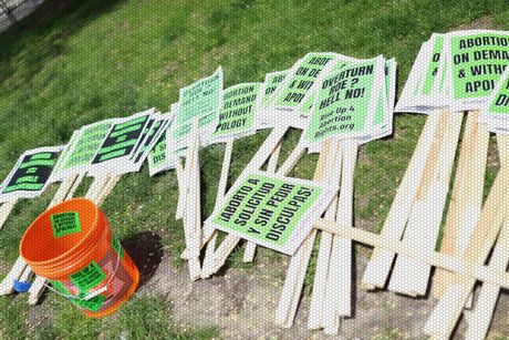 Photo depicting a local activist's sign outside of Oak Woods Cemetery during a Confederate mass grave protest.