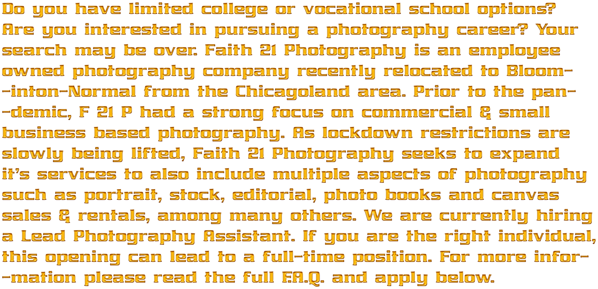 To start, the position will be on a part time basis. As the industry bounces back into shape and the economy rebounds, the job will grow into a full time position. Accepted candidates will accompany our award winning photographer to location & in studio. Candidates will be responsible for fulfilling the duties of a photography assistant including but not limited to assisting with shoot set ups, holding reflectors, assisting with lightning conditions, standing-in for shot set-ups, basic make-up and more. Candidates will work in teams of two-three throughout portions of the surrounding Midwest via bus, train or car. Faith 21 Photography will have an advertising presence in many large markets such as Chicago and surrounding suburbs, St. Louis, Milwaukee, Kansas City, Cincinnati, Omaha, Indianapolis, Detroit, South Bend, Rockford, Kenosha and more. Additionally, accepted candidates who choose to advance will be trained in every relevant aspect of owning a photography business including essential tasks such as book keeping practices, Marketing & promotion, general business administration, lighting design & technician duties, key production assistance, model management, studio editing & retouching and eventually fine photography.